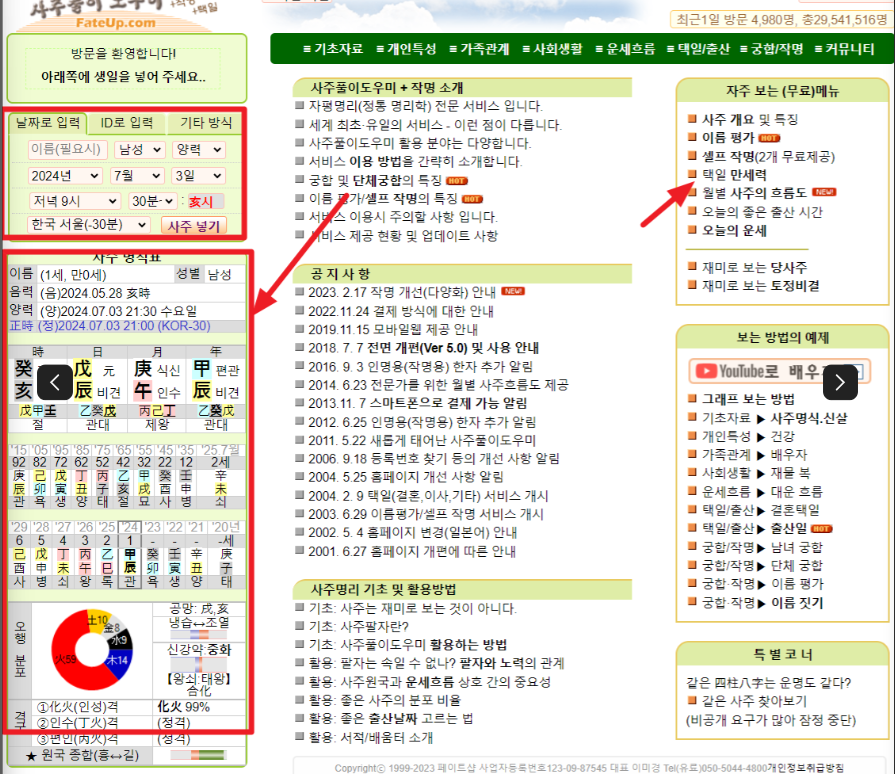 가장 먼저 사주 명식표를 입력해야 하는데 위 사이트를 통해 사주풀이 도우미 사이트로 이동 후 생년월일 및 태어난 시를 입력해주면 아래 사주명식표가 나옵니다.