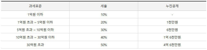 증여세율은 과세표준에 따라 10%에서 50%까지 차등 적용됩니다.
