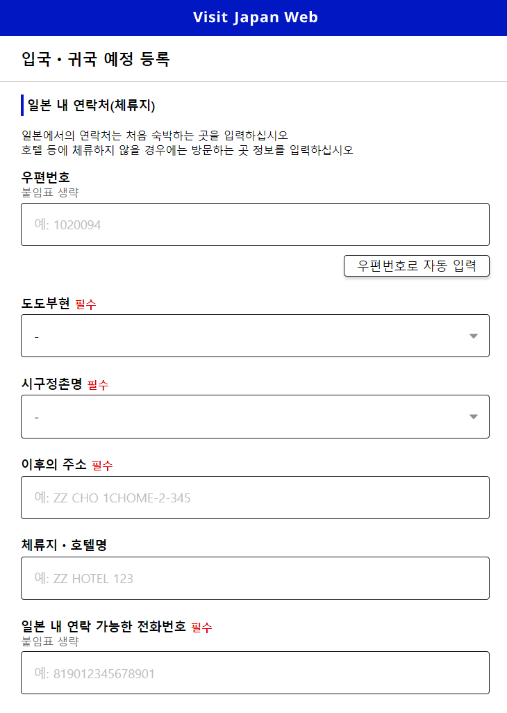- 체류지 정보: 일본에서 머물 숙소 또는 주소를 기재합니다.