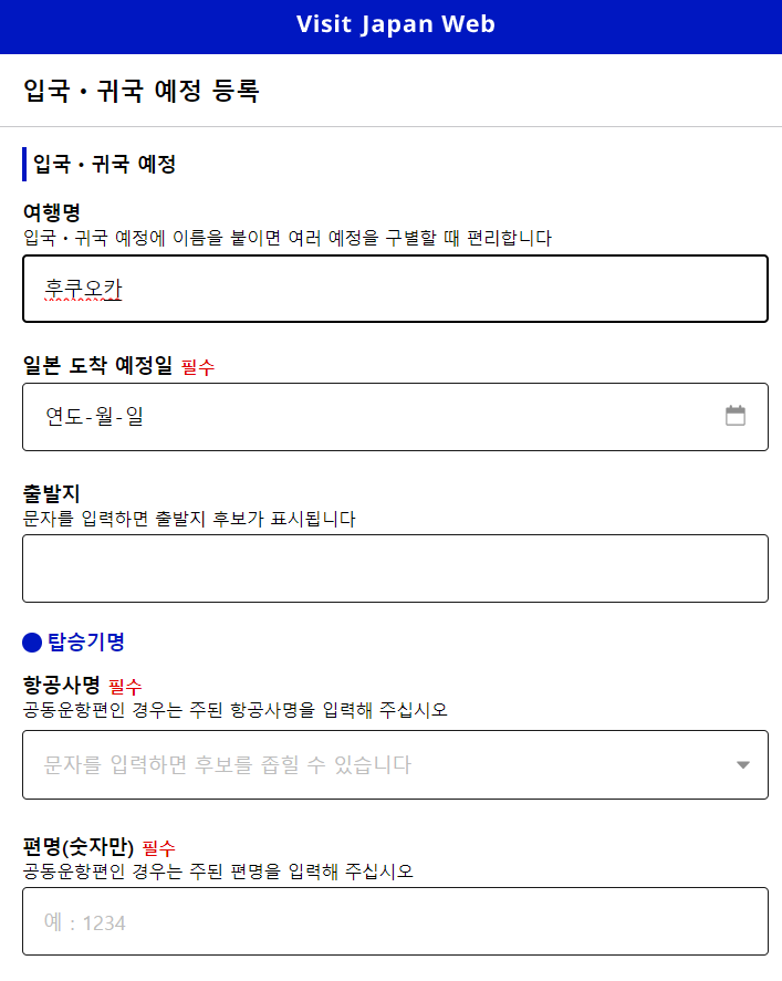 - 여행 일정: 일본에 도착하는 날짜와 시간을 입력합니다.