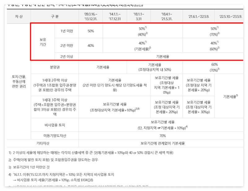 먼저 상가 건물의 양도소득세율은 보유기간에 따라 1년 미만 보유할 경우에는 50% 세율이적용되고 1년 ~ 2년 미만일 경우 40% 세율, 그리고 2년 이상 보유했다면 기본세율이 적용됩니다.
