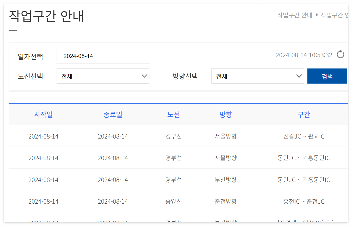 작업구간 확인하여 전국에서 진행하고 있는 작업구간을 파악할 수도 있습니다. 이러한 작업구간은 교통혼잡이 예상되므로 우회도로를 통해 이동하는 것도 방법입니다.