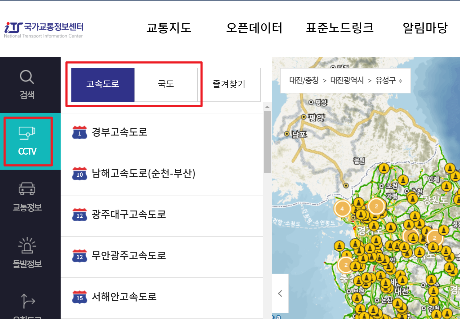 해당 사이트 상단에서 고속도로가 궁금하신 분들은 고속도로 탭을 클릭, 국도가 궁금하신 분들은 국도를 클릭해주시기 바랍니다.