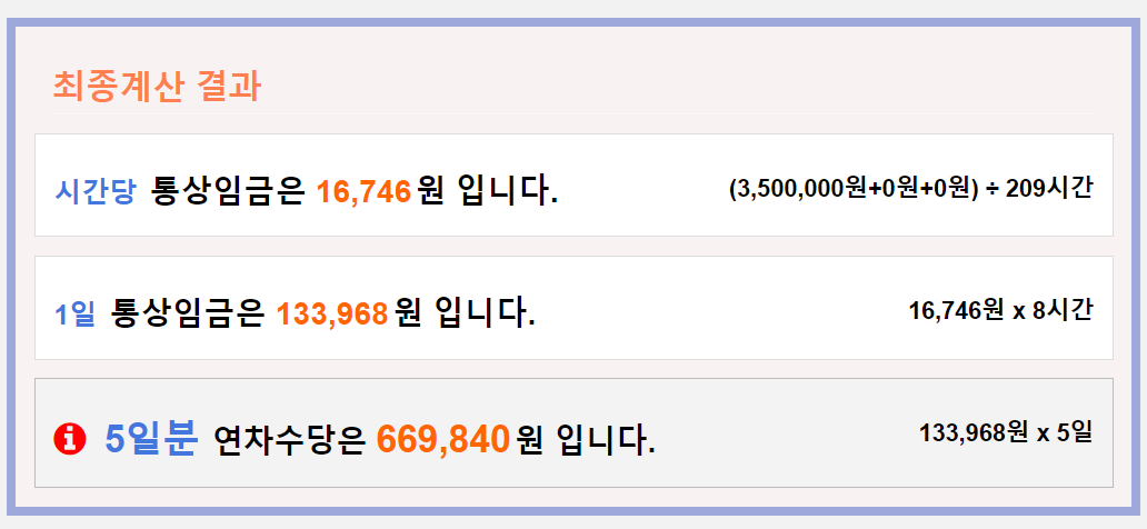 이 처럼 연차휴가일수 미사용한 일 수가 5일이라고 하고 매월 내가 받는 급여가 350만원이라고 했을 때 1일 통상임금이 133,968원이므로 이에 5를 곱하여 계산하는 것 입니다.