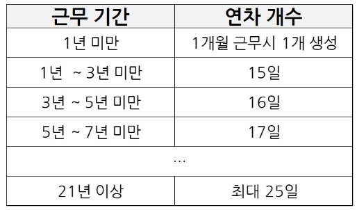 1년 이상 근무한 근로자는 1년동안 15개의 연차휴가일수가 생성됩니다. 그리고 3년 이상 근무했을 때부터 2년에 1개씩 연차휴가일수가 생성되는 방식입니다.