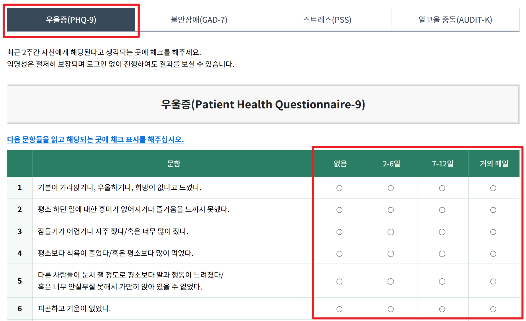 인사혁신처 외 또 다른 우울증 자가진단 테스트를 해보고 싶은 분들은 좀 더 확실하게 나의 정신 건강 상태를 알 수 있습니다.