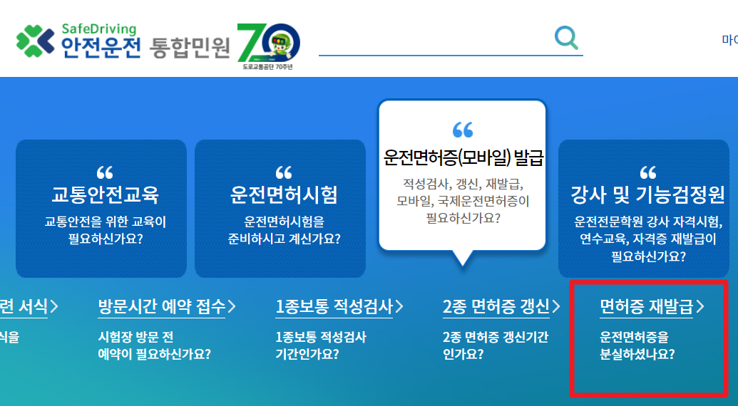 운전면허 분실신고하는곳은 총 3곳인데요, 집 근처에 있는 경찰서를 방문하셔도 되고 운전면허시험장이나 아래에서 안내해드릴 도로교통공단 안전운전 사이트 입니다.