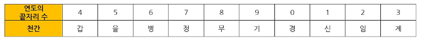 천간: 천간은 하늘의 에너지를 나타내며, 양력 연도의 마지막 숫자에 따라 결정됩니다. 천간은 나무, 불, 흙, 금속, 물의 다섯 원소와 관련이 있으며, 이 원소들은 사람의 성격과 운명에 영향을 줍니다.