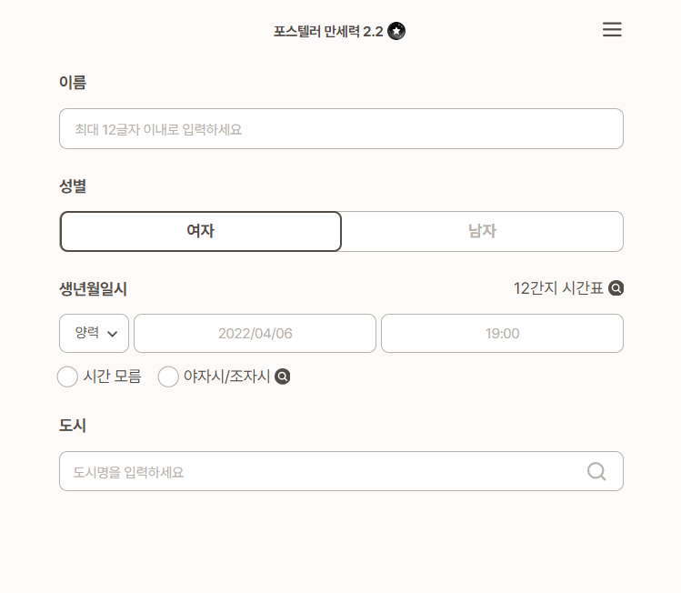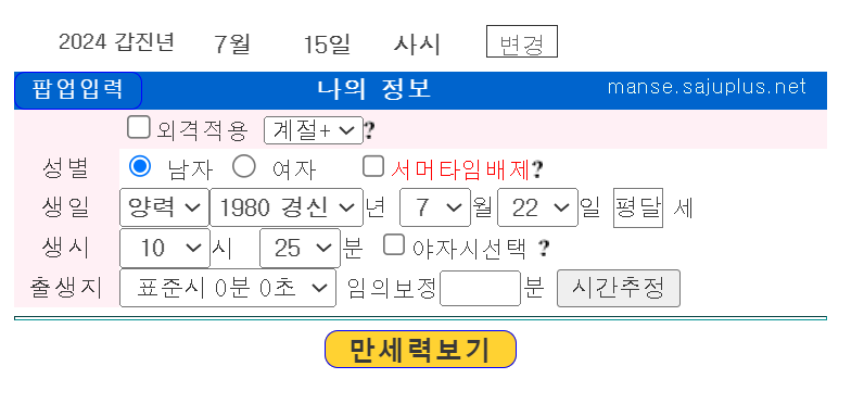 이름과 성별, 생년월일시, 도시까지 입력 하고 만세력 보러가기 버튼을 클릭해줍니다.