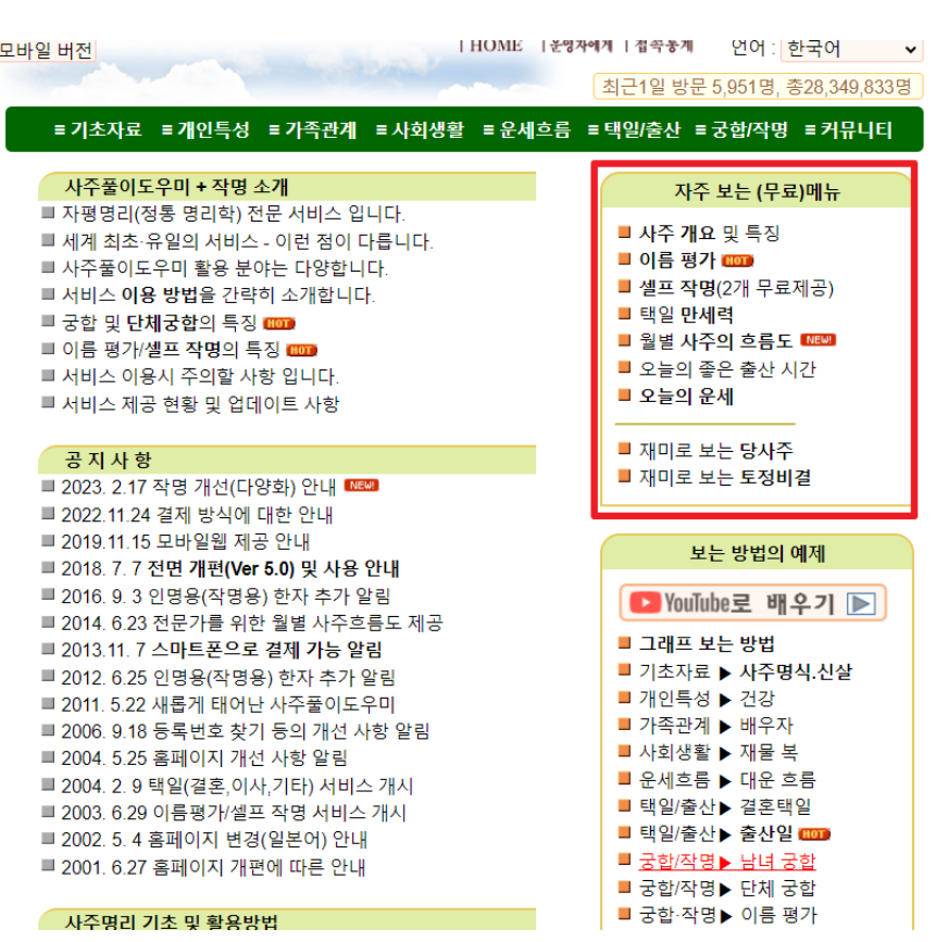 단순 사주 풀이가 아닌 명리 학, 관 상, 손 금 등 여러가지를 볼 수 있어 꽤 많은 사람들이 매일 찾아오는 인기 있는 사이트라고 할 수 있습니다.
