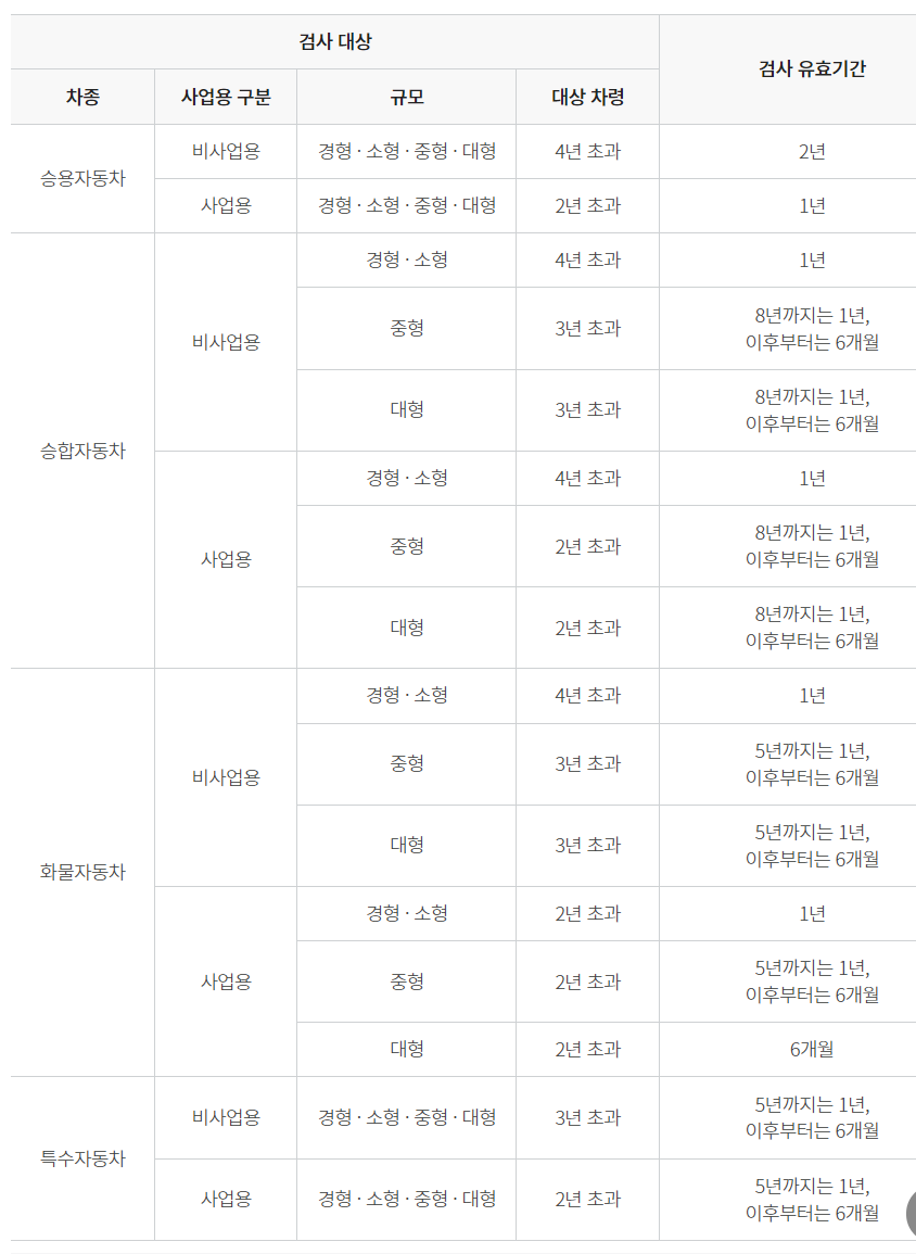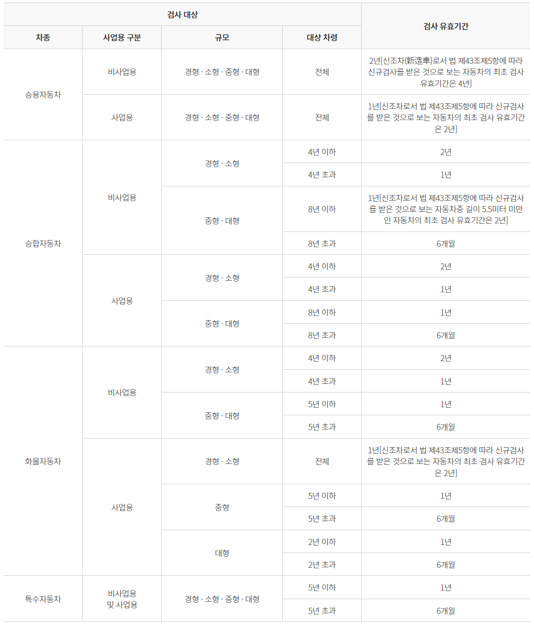 자동차검사 유효기간은 아래 표를 참고하시면 됩니다. 차량의 종류와 규모, 그리고 사업용 구분에 따라 자동차검사 유효기간이 각각 다르게 적용되기 때문에 될 수 있으면 조회 서비스를 통해 유효기간을 확인하는 것이 좋습니다.