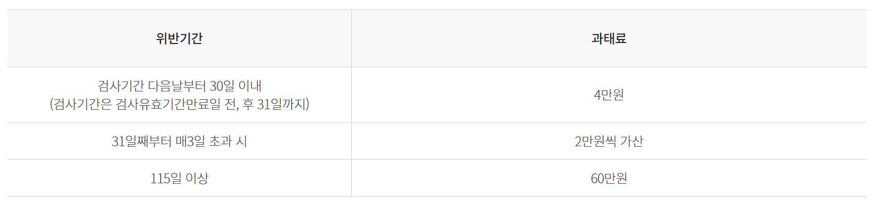검사기간 내에 받을 경우 과태료가 없으나 다음날부터 30일 이내까지 4만원의 과태료과 부과되고 이를 어긴 후 31일 째부터는 매 3일마다 2만원씩 가산되어 최대 60만원까지 과태료가 부과됩니다.