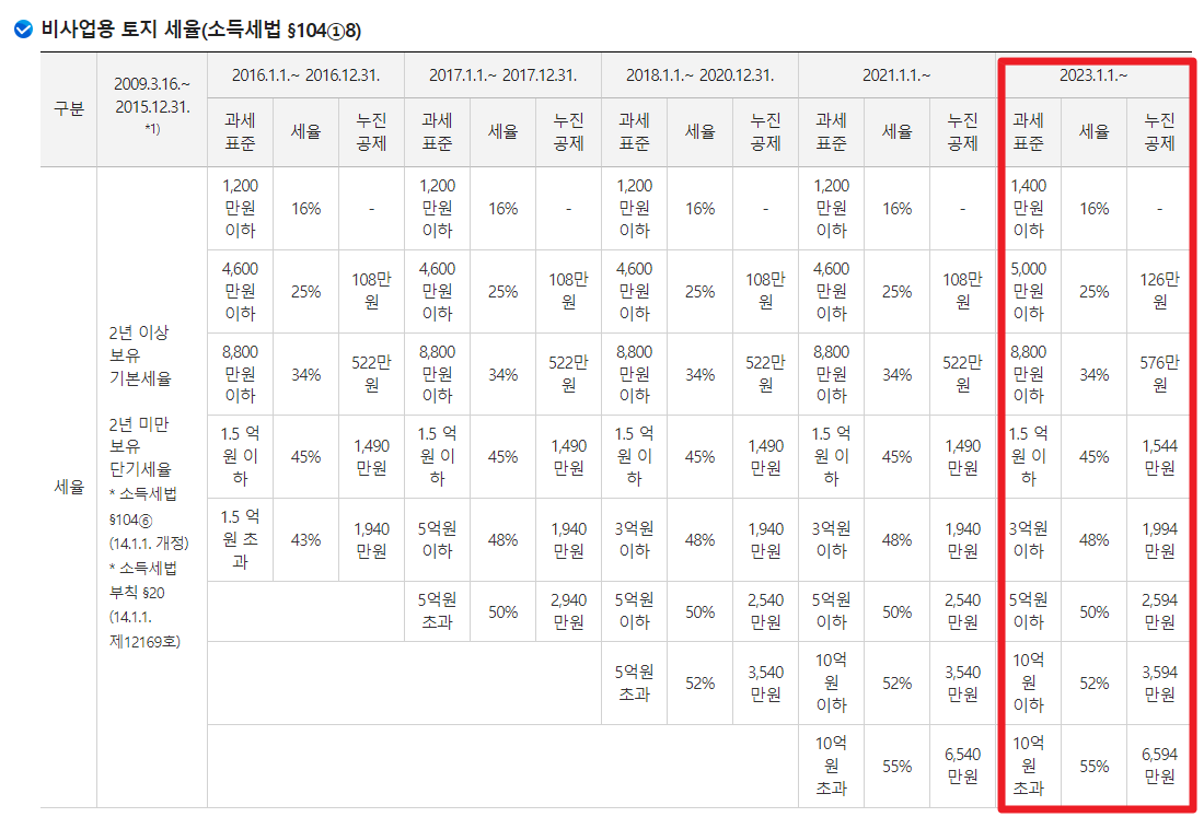 2년 이상 보유할 경우 6% ~ 42% 사이의 기본세율이 적용되지만 2년 미만 보유 할 경우단기세율이 적용되어 40%, 1년미만 보유할 경우에는 50%나 적용되므로 되도록이면 오랜 기간 토지를 보유하고 있는 편이 양도세를 아낄 수 있는 방법입니다.