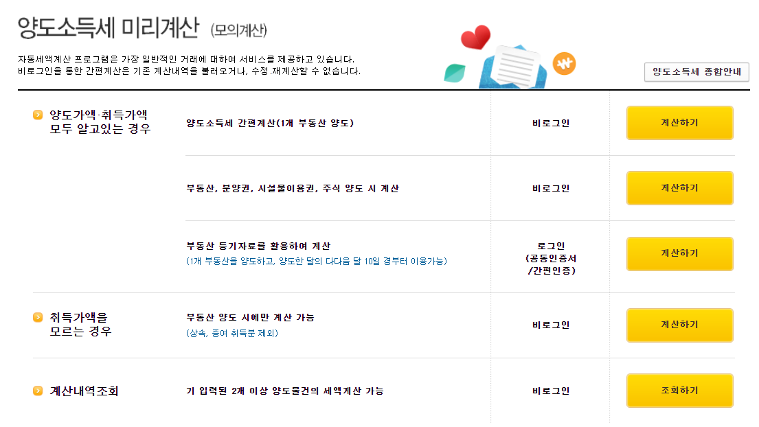 양도소득세 계산을 위해 위 버튼을 클릭한 뒤 내가 알고있는 정보에 따라 로그인하거나 로그인을 하지 않아도 양도소득세를 구할 수 있습니다.