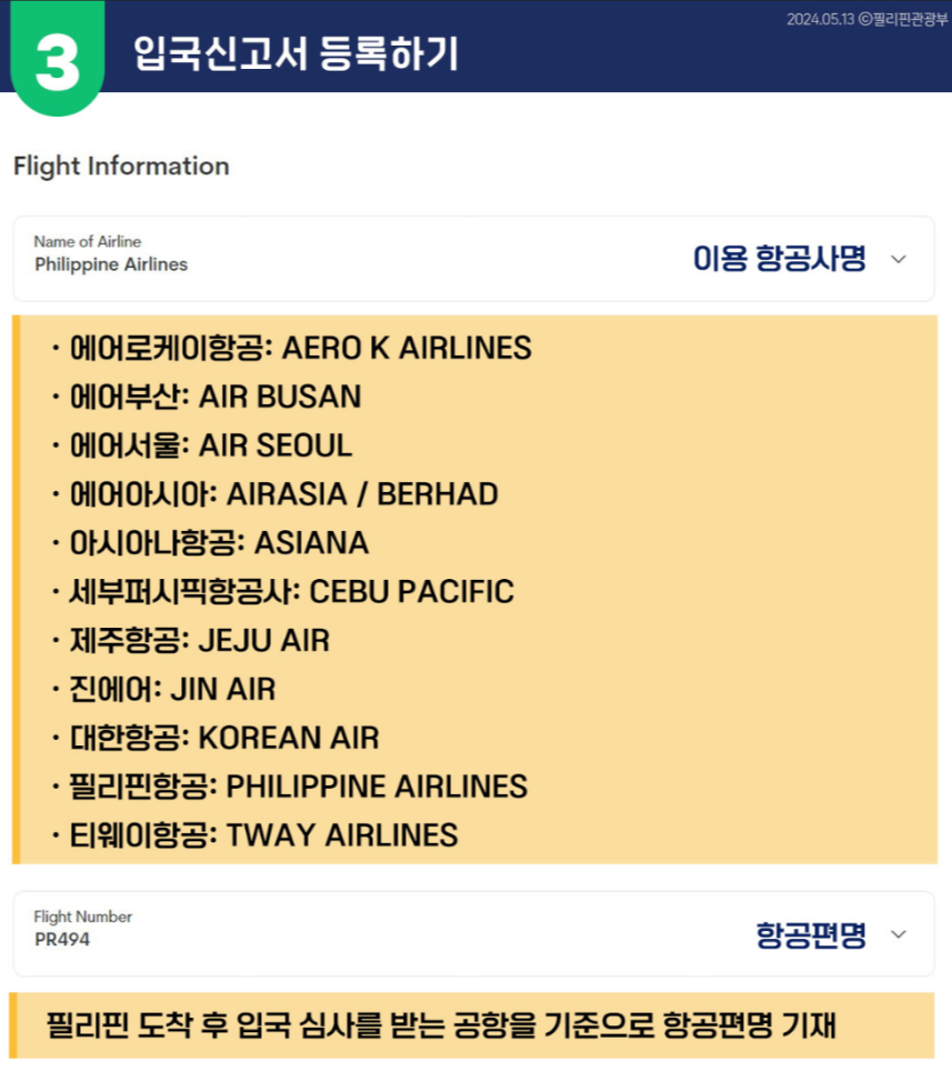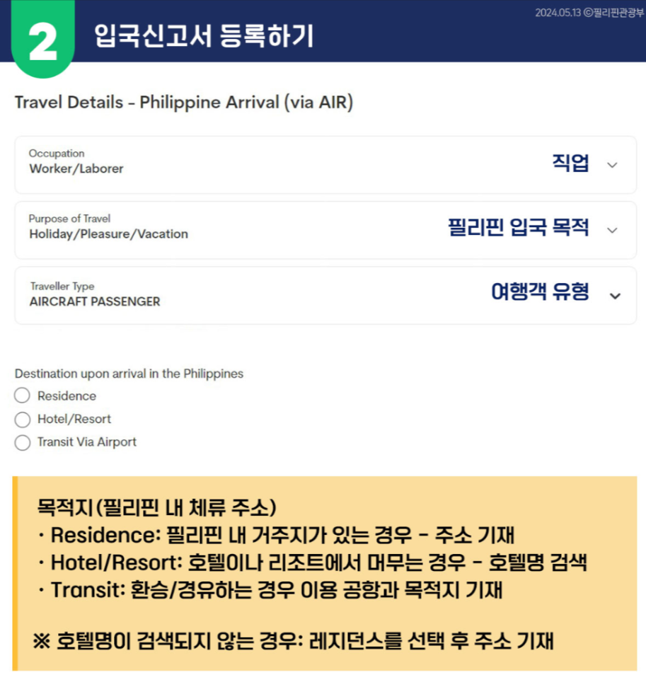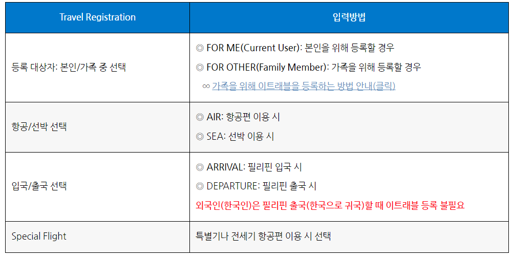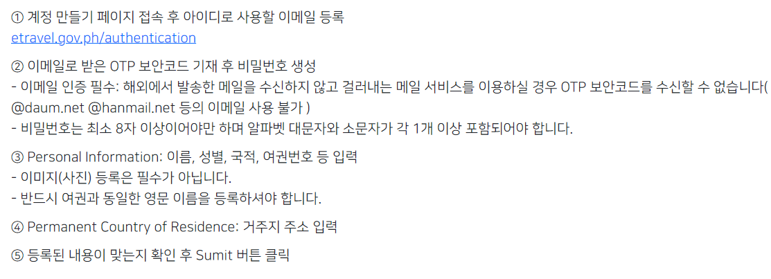필리핀 이트래블 내 잘못된 정보를 입력할 경우 입국 전 문제가 발생할 수 있으므로 정직하게 작성해주시기 바랍니다.