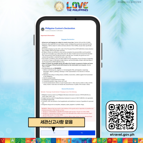 QR코드는 필리핀 공항으로 입국하기 전 필수적으로 제시해야 하기 때문에 미리 캡쳐하여 사진함에 저장해놓으시는 것을 권장 드립니다.